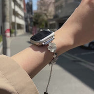 Verleihen Sie Ihrer Smartwatch einen Hauch von Stil mit einem Armband, das florale Zartheit und raffiniertes Design vereint. Dieses Schmuckstück verwandelt jede Apple Watch in ein echtes Highlight, dank seiner feinen Kette, die mit emaillierten Blüten inspiriert von japanischen Kirschbäumen verziert ist. Die Strassdetails sorgen für einen dezenten Glanz, während die Kette mit einem kleinen Herzanhänger eine subtile emotionale Note setzt.