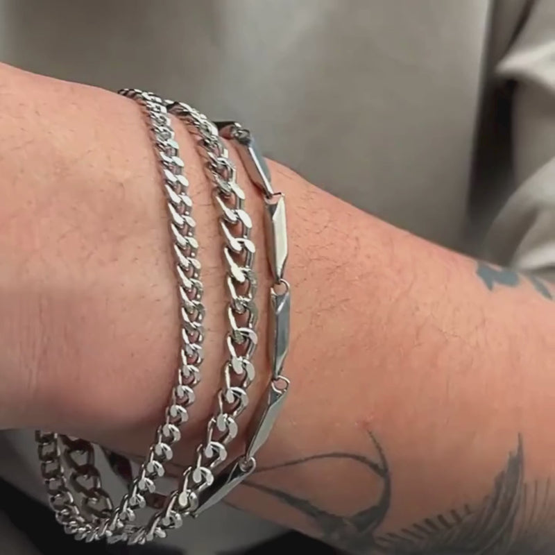 The look is enhanced by the subtle shine of titanium, capturing the light to reveal a delicate glow. These bracelets stand out with their bold design: the Cuban link, known for its masculine appeal and precise structure. This trio offers a versatile experience; wear them together for a trendy layered effect or individually for a touch of sophistication. These pieces integrate perfectly into a modern wardrobe, complementing both casual and formal outfits.