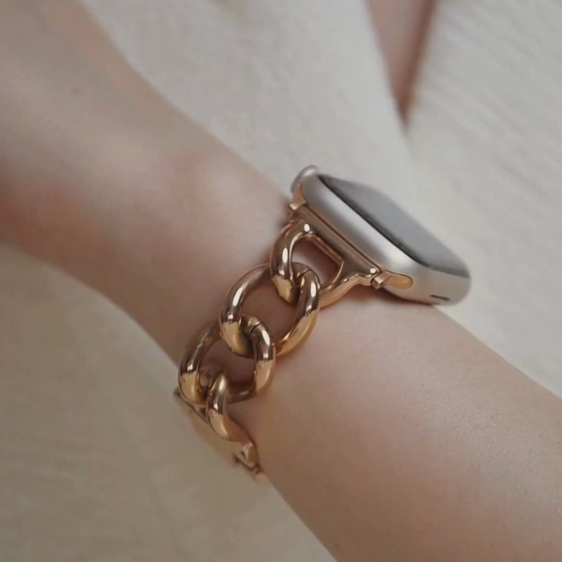 Elegance takes on a whole new dimension with this Apple Watch bracelet featuring wide curb-style links. Each link conveys a rare visual strength, subtly balanced by full curves and ultra-smooth finishes. This bold design evokes a contemporary piece of jewelry that pairs just as well with a casual outfit as with a more assertive look. This is not simply an accessory, but a statement that reinvents the connected watch as a stylish object of desire.