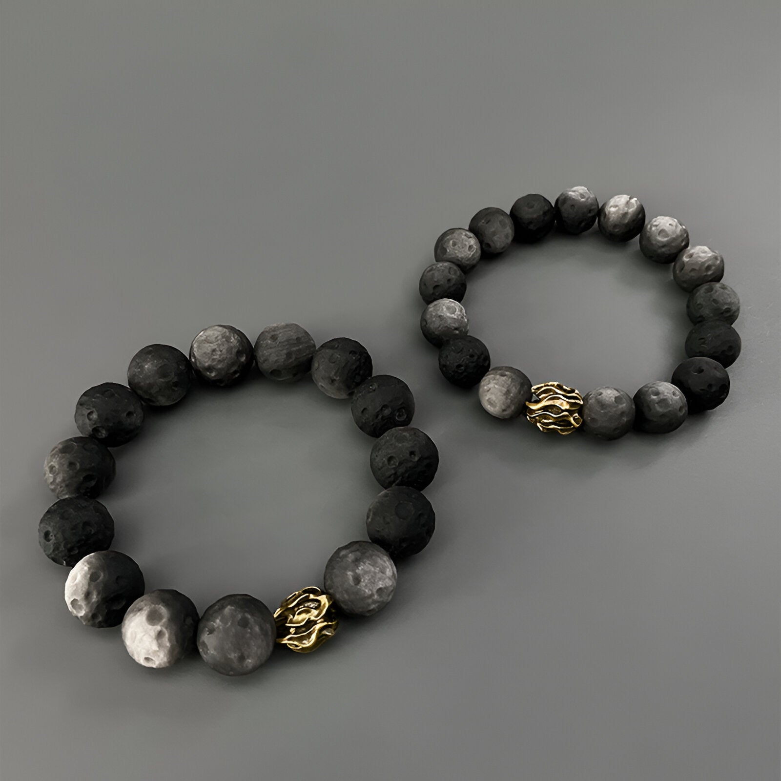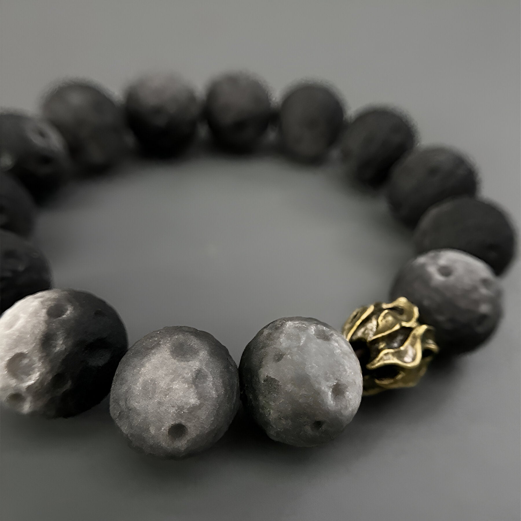 Inspirado en la mística lunar, este pulsera de cuentas encarna una elegancia sencilla y una presencia que no pasa desapercibida. Cada cuenta de obsidiana natural ha sido cuidadosamente seleccionada por su calidad y su aspecto único, recordando la superficie veteada de la piedra lunar. La textura celestial de las cuentas, junto con su tono oscuro y profundo, hacen de este accesorio un complemento cautivador que no dejará indiferente a nadie.