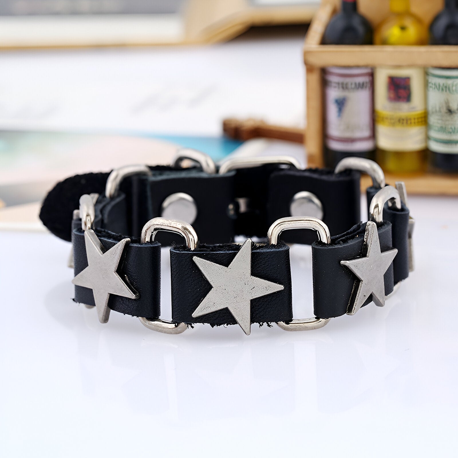 Muestra tu audacia y deja brillar tu personalidad con esta pulsera de cuero con estrellas, el accesorio que realza cada momento.