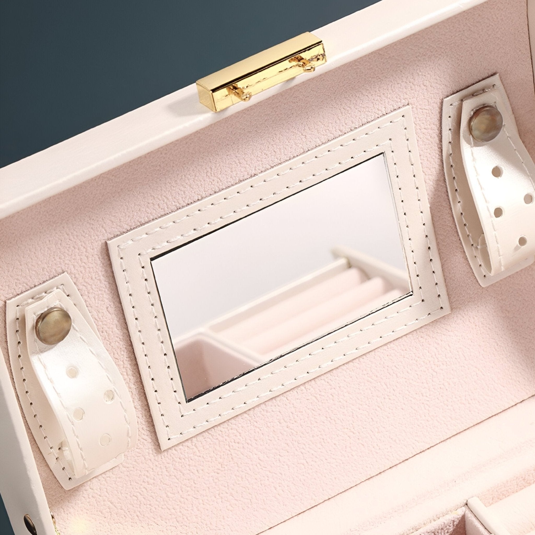 Descubre una caja de joyas elegante que combina practicidad y diseño refinado. Pensada para organizar tus tesoros con cuidado, cuenta con varios compartimentos perfectamente distribuidos, ideales para guardar anillos, pulseras, collares y otros accesorios. Cada espacio está cuidadosamente diseñado para optimizar el almacenamiento y proteger la delicadeza de tus joyas. Gracias a su espejo integrado, puedes ajustar tus accesorios fácilmente antes de salir, añadiendo un toque funcional a este imprescindible.