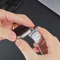 Chaque courbe, chaque angle du bracelet a été pensé pour épouser naturellement la forme du poignet, tout en assurant un maintien sécurisé. Le fermoir papillon, intégré de manière discrète, permet une fermeture fluide et invisible, renforçant l’effet d’un bracelet tout d’un bloc. Il épouse parfaitement les formats Apple Watch de 44 à 49 mm, s’adaptant aux séries récentes pour une compatibilité fluide et sans compromis.