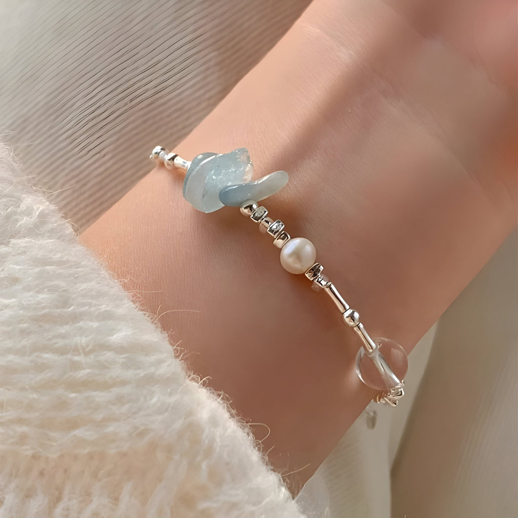 Le bracelet se compose de pierres naturelles d'aigue-marine, sélectionnées pour leur douce couleur bleue rappelant la sérénité des eaux claires. Elles s'allient harmonieusement à des perles naturelles aux reflets nacrés, ajoutant un éclat délicat à cet assemblage précieux. La structure est faite d'argent sterling, promettant non seulement une brillance intemporelle mais aussi une qualité qui perdure.